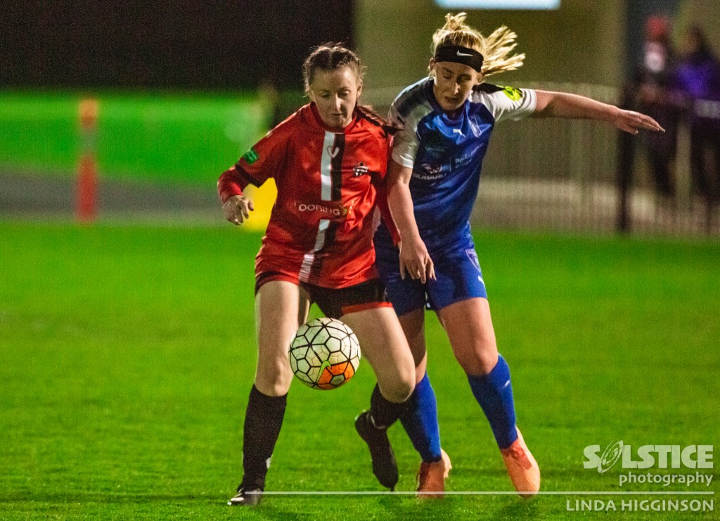 Instead hope was from the flanks for both sides. Once it was apparent M Chambers was marked out of the game, the right hand side became favoured for the away team. The ball shifted from the backline to Gubb with consistency. While the only time Davies had room to manoeuvre, she drew the foul and yellow card from Steventon. Opportunities forward were rarer for the home team, but the threats were from the flanks when they arrived.
